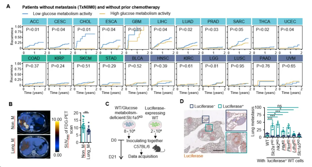 通过对15种肿瘤类型的大样本数据分析发现,肿瘤组织中葡萄糖代谢活性低的患者术后2年内复发风险明显升高。在多个小鼠肿瘤模型中,无论采用低碳水化合物饮食还是肿瘤糖酵解通路基因敲除,均观察到显著增强的肺部转移现象,且与原发瘤体积无关。